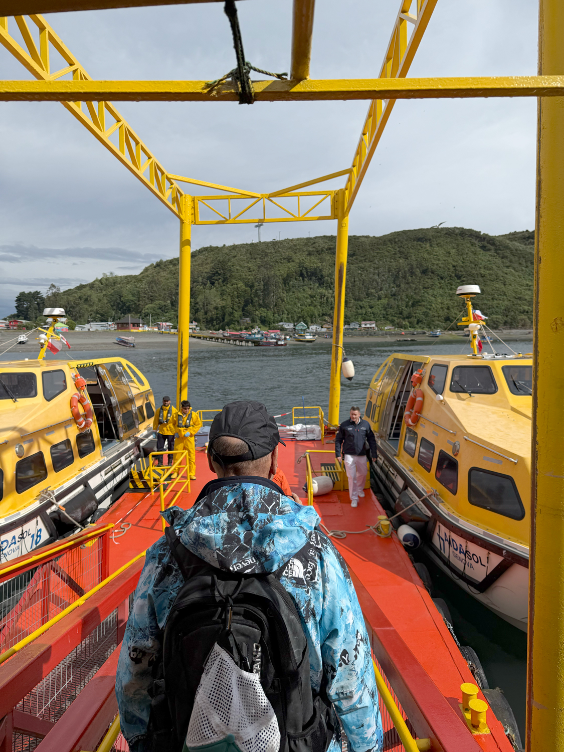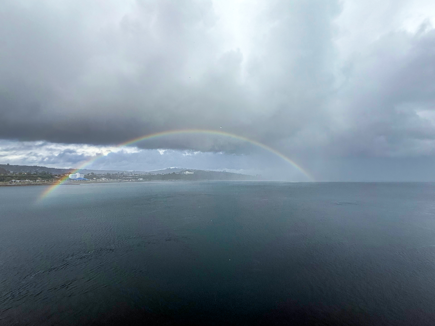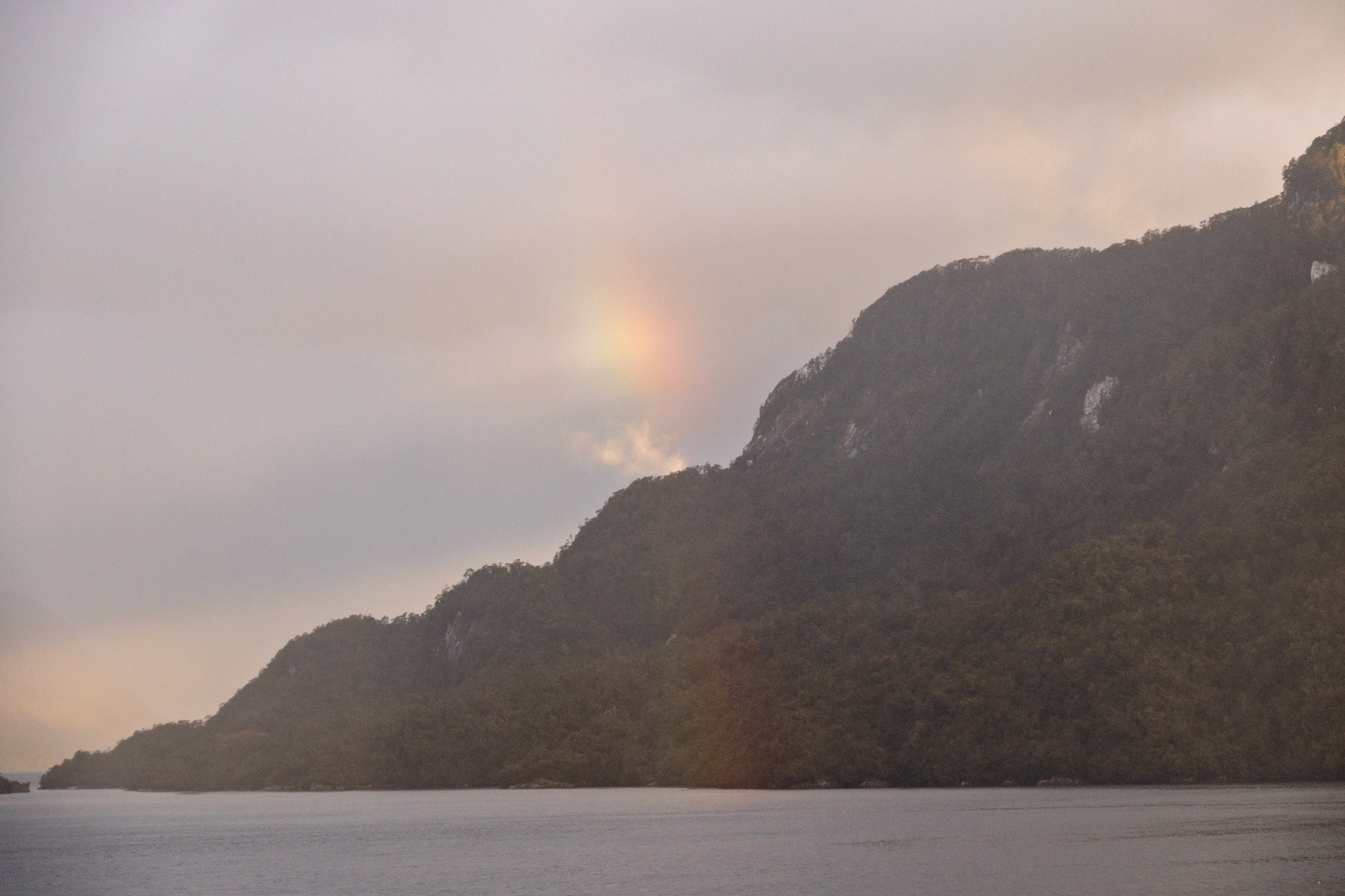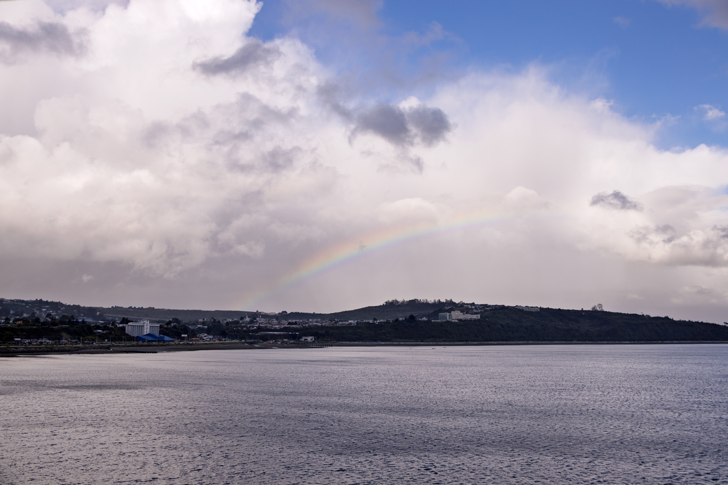 Am Schiff angekommen ziehen wieder Regenschauer über Puerto Montt. Es folgt ein beeindruckendes Schauspiel stetig wechselnder Regenbögen, sehr schön anzusehen.