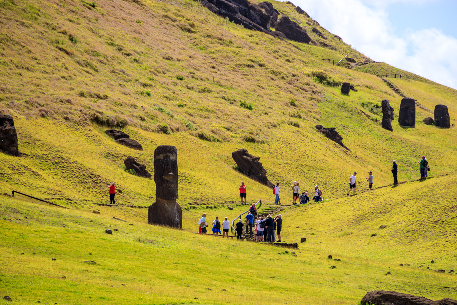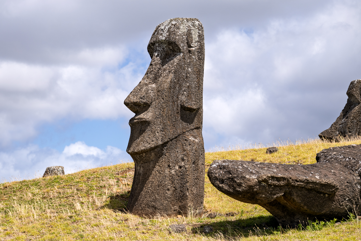wurden – war unser erster Halt. Hier liegen unfertige Riesen im Vulkangestein, als hätten ihre Schöpfer sie vor Jahrhunderten einfach zurückgelassen. Moai Tukuturi, eine ungewöhnliche Statue mit gebeugten Knien, ließ mich staunen. Warum unterscheidet sie sich von den anderen? Vielleicht ein Hinweis auf einen Wandel in der Kultur der Rapa Nui?