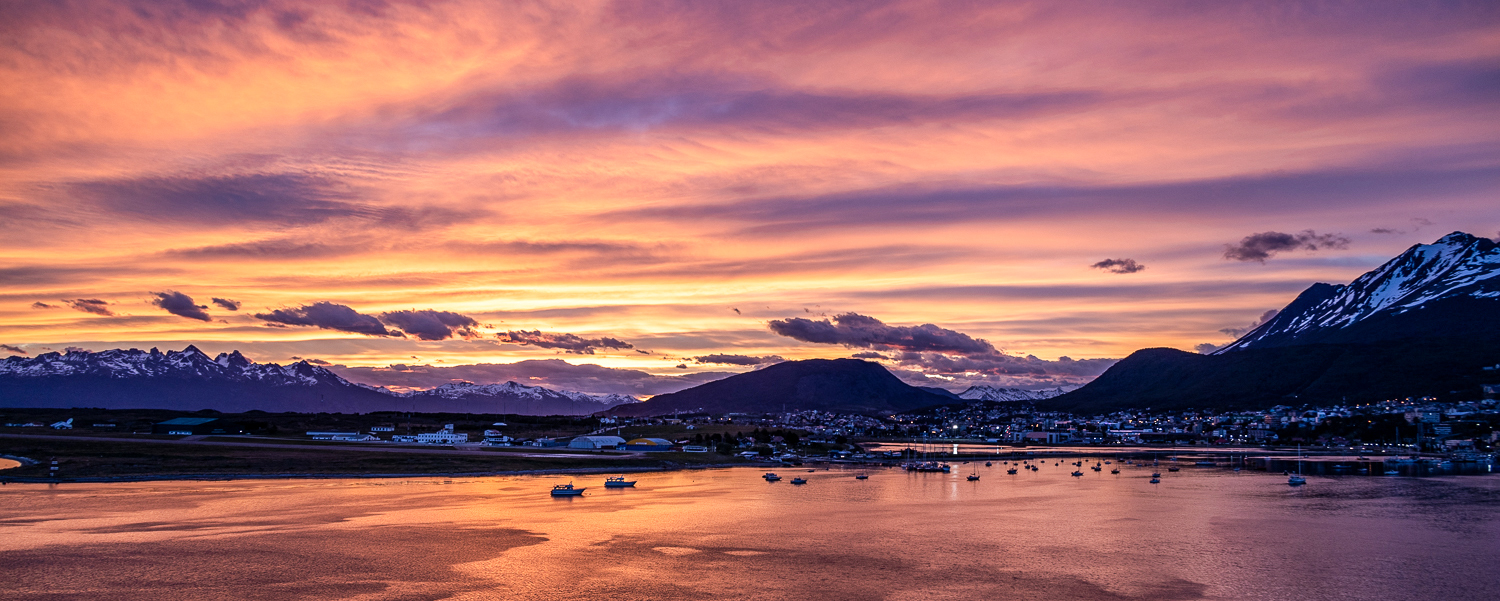Als die Sonne sich verabschiedet, brechen wir auf nach Ushuaia. Ein kurzer Stop in Nacht in Puerto Williams für die chilenischen Einreiseformalitäten, dann erreichen wir am Morgen die südlichste Stadt der Welt, Ushuaia.