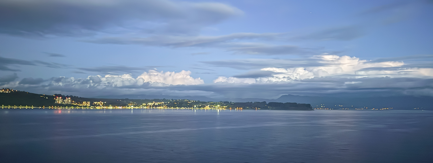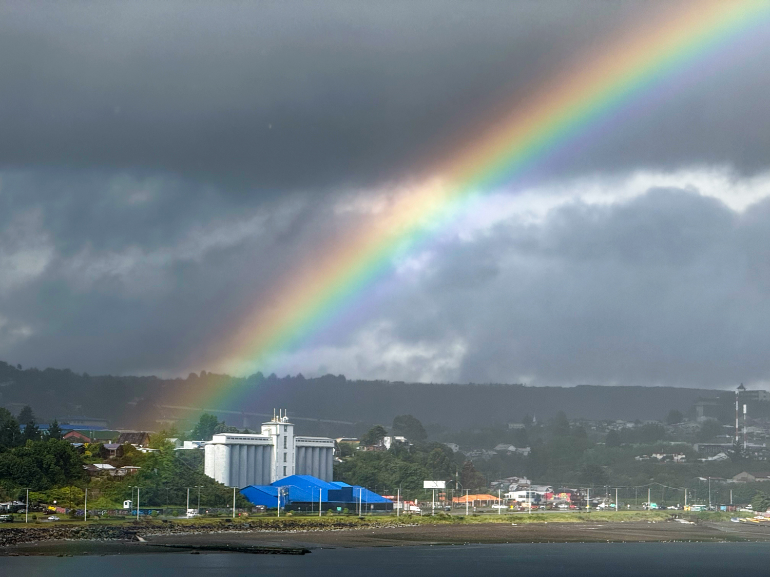 Am Schiff angekommen ziehen wieder Regenschauer über Puerto Montt. Es folgt ein beeindruckendes Schauspiel stetig wechselnder Regenbögen, sehr schön anzusehen.